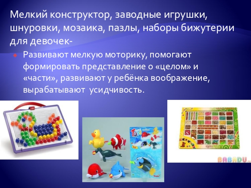 Слайд 15Мелкий конструктор, заводные игрушки, шнуровки, мозаика, пазлы, наборы бижутерии для девочек-