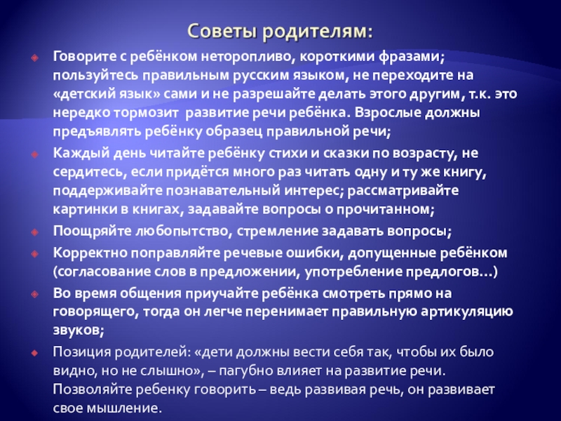 Слайд 18Говорите с ребёнком неторопливо, короткими фразами; пользуйтесь правильным русским языком, не