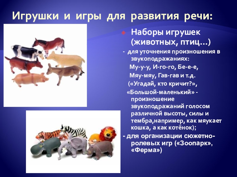 Предлагаемые далее игрушки и игры могут быть использованы для развития у детей слухового внимания, правильного восприятия речи, учить детей соотносить звучащее слово с картинкой или предметом, внятно произносить слова различной структуры , отвечать на вопросы; громко и тихо воспроизводить звукоподражания.