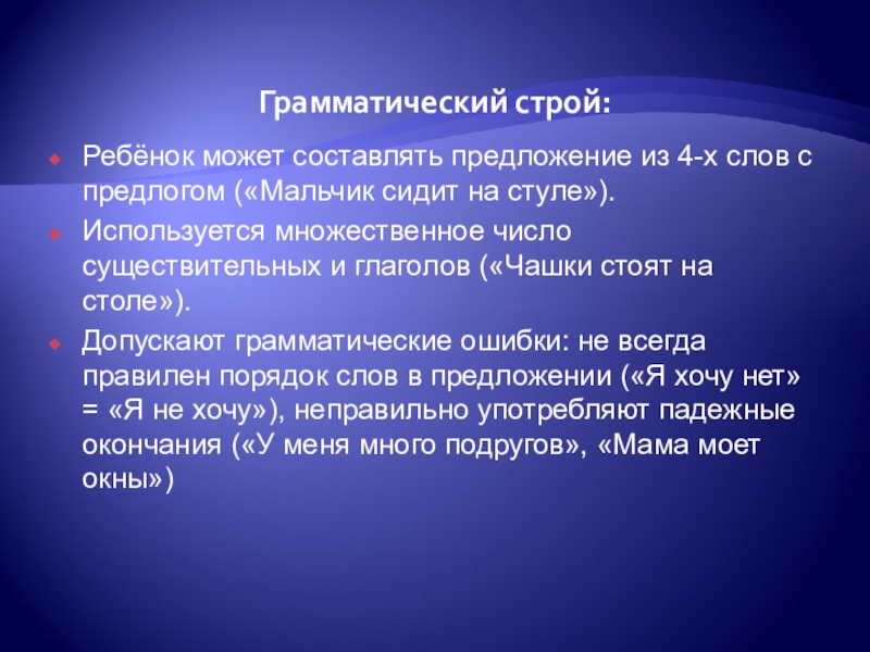 Допускают грамматические ошибки: не всегда правилен порядок слов в предложении («Я хочу нет»= «Я не хочу»), неправильно употребляют падежные окончания («У меня много подругов», «Мама моет окны»)
