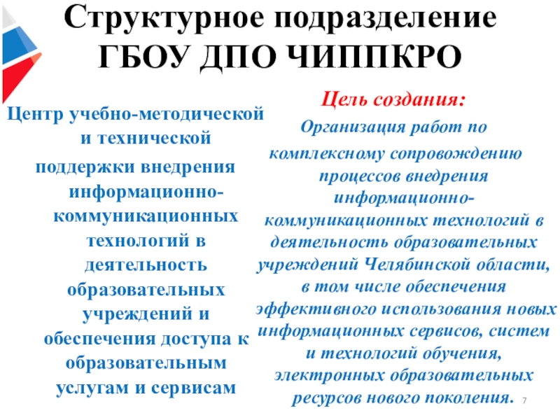 комплексному сопровождению процессов внедрения информационно-коммуникационных технологий в деятельность образовательных учреждений Челябинской области, в том числе обеспечения эффективного использования новых информационных сервисов, систем и технологий обучения, электронных образовательных ресурсов нового поколения.