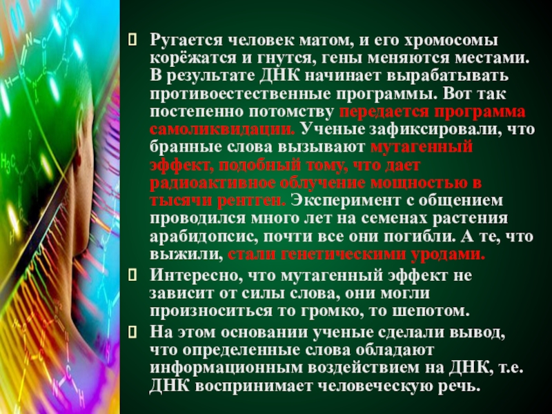 гены меняются местами. В результате ДНК начинает вырабатывать противоестественные программы. Вот так постепенно потомству передается программа самоликвидации. Ученые зафиксировали, что бранные слова вызывают мутагенный эффект, подобный тому, что дает радиоактивное облучение мощностью в тысячи рентген. Эксперимент с общением проводился много лет на семенах растения арабидопсис, почти все они погибли. А те, что выжили, стали генетическими уродами.