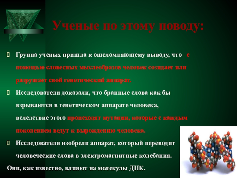 Исследователи доказали, что бранные слова как бы взрываются в генетическом аппарате человека, вследствие этого происходят мутации, которые с каждым поколением ведут к вырождению человека.