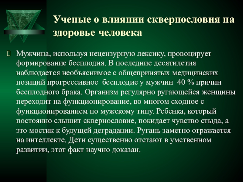 формирование бесплодия. В последние десятилетия наблюдается необъяснимое с общепринятых медицинских позиций прогрессивное бесплодие у мужчин 40 % причин бесплодного брака. Организм регулярно ругающейся женщины переходит на функционирование, во многом сходное с функционированием по мужскому типу. Ребенка, который постоянно слышит сквернословие, покидает чувство стыда, а это мостик к будущей деградации. Ругань заметно отражается на интеллекте. Дети существенно отстают в умственном развитии, этот факт научно доказан.