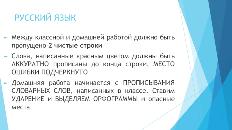 РУССКИЙ ЯЗЫКМежду классной и домашней работой должно быть пропущено 2 чистые строкиСлова, написанные красным цветом должны быть АККУРАТНО прописаны до конца строки, МЕСТО ОШИБКИ ПОДЧЕРКНУТОДомашняя работа начинается с ПРОПИСЫВАНИЯ СЛОВАРНЫХ СЛОВ, написанных в классе. Ставим УДАРЕНИЕ