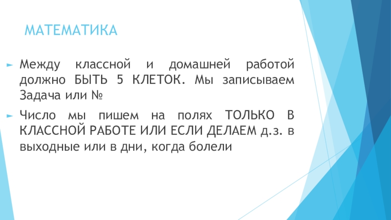 МАТЕМАТИКАМежду классной и домашней работой должно БЫТЬ 5 КЛЕТОК. Мы записываем Задача или №Число мы пишем на