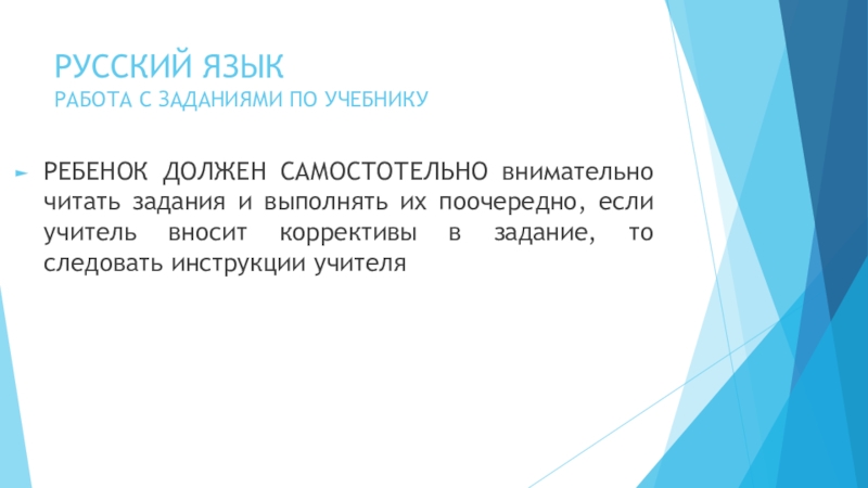 РУССКИЙ ЯЗЫК РАБОТА С ЗАДАНИЯМИ ПО УЧЕБНИКУРЕБЕНОК ДОЛЖЕН САМОСТОТЕЛЬНО внимательно читать задания и выполнять их поочередно, если