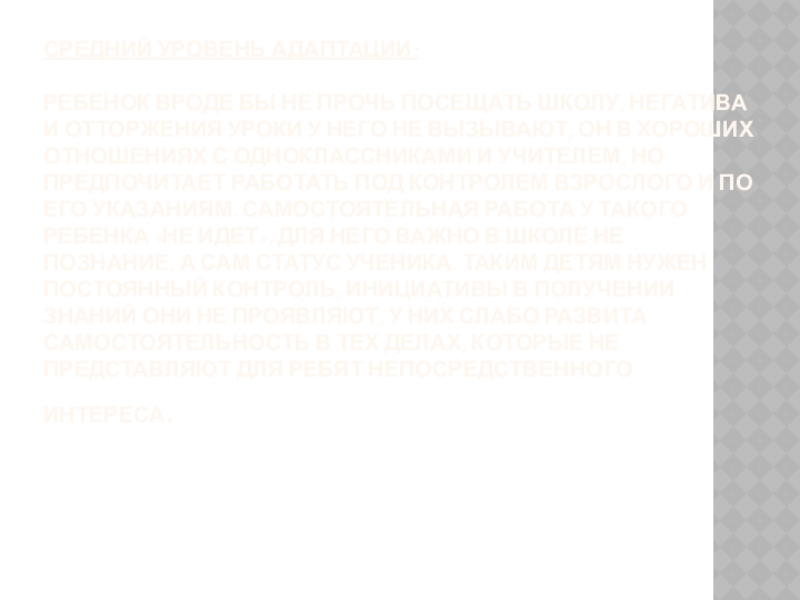 отторжения уроки у него не вызывают, он в хороших отношениях с одноклассниками и учителем, но предпочитает работать под контролем взрослого и по его указаниям. Самостоятельная работа у такого ребенка «не идет». Для него важно в школе не познание, а сам статус ученика. Таким детям нужен постоянный контроль, инициативы в получении знаний они не проявляют, у них слабо развита самостоятельность в тех делах, которые не представляют для ребят непосредственного интереса.