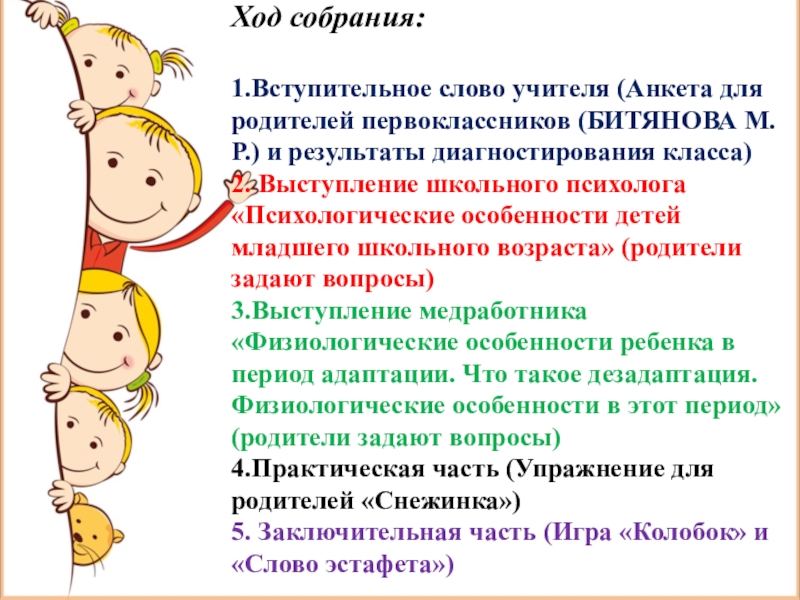 Слайд 4Ход собрания: 1.Вступительное слово учителя (Анкета для родителей первоклассников (БИТЯНОВА М.Р.) и