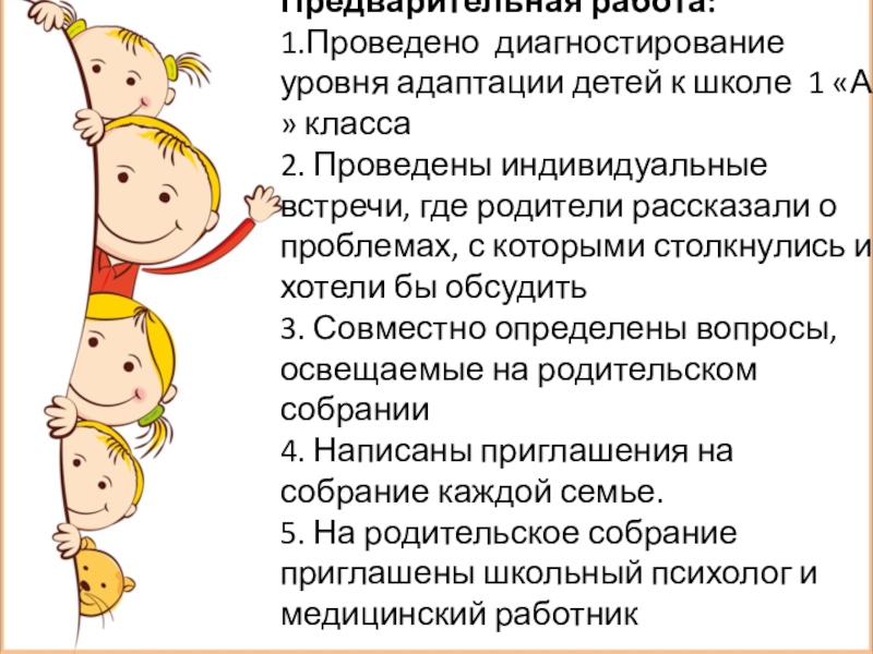 Слайд 2Предварительная работа: 1.Проведено диагностирование уровня адаптации детей к школе 1 «А »