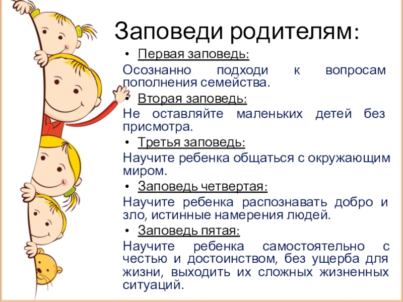 Заповеди родителям:Первая заповедь: Осознанно подходи к вопросам пополнения семейства.Вторая заповедь: Не оставляйте маленьких детей без присмотра.Третья заповедь:Научите