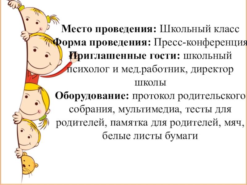 Слайд 3 Место проведения: Школьный класс Форма проведения: Пресс-конференция Приглашенные гости: школьный психолог и мед.работник,