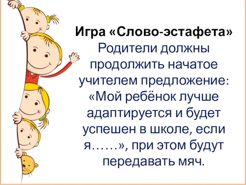 Слайд 10Игра «Слово-эстафета» Родители должны продолжить начатое учителем предложение: «Мой ребёнок лучше адаптируется
