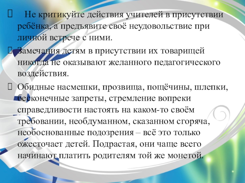 Не критикуйте действия учителей в присутствии ребёнка, а предъявите