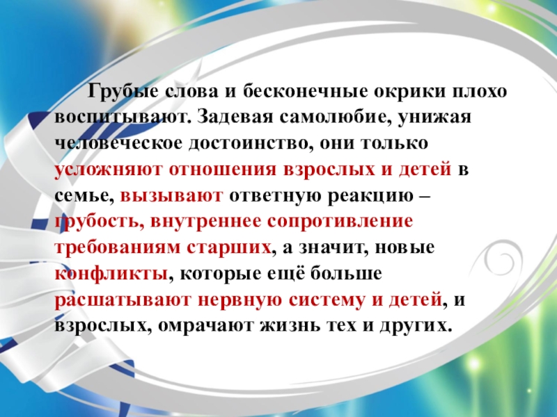 воспитывают. Задевая самолюбие, унижая человеческое достоинство, они только усложняют отношения взрослых и детей в семье, вызывают ответную реакцию – грубость, внутреннее сопротивление требованиям старших, а значит, новые конфликты, которые ещё больше расшатывают нервную систему и детей, и взрослых, омрачают жизнь тех и других.