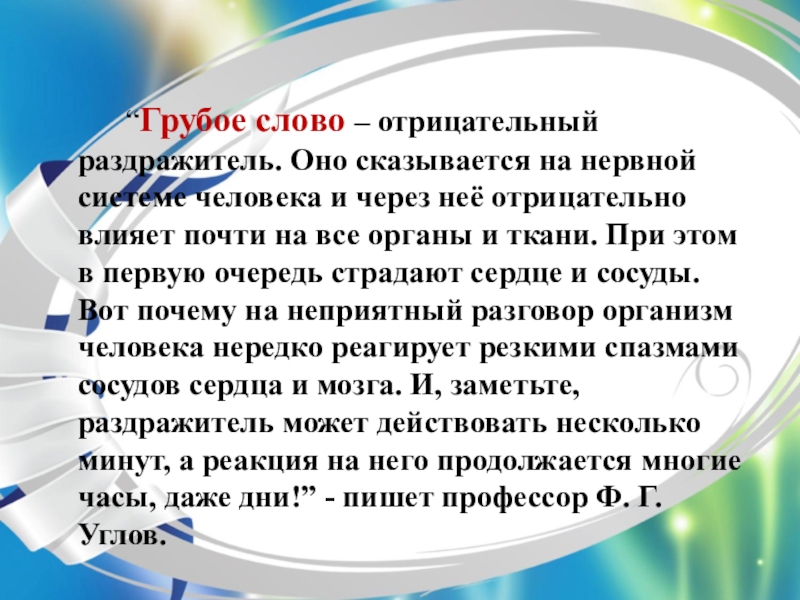 сказывается на нервной системе человека и через неё отрицательно влияет почти на все органы и ткани. При этом в первую очередь страдают сердце и сосуды. Вот почему на неприятный разговор организм человека нередко реагирует резкими спазмами сосудов сердца и мозга. И, заметьте, раздражитель может действовать несколько минут, а реакция на него продолжается многие часы, даже дни!” - пишет профессор Ф. Г. Углов.
