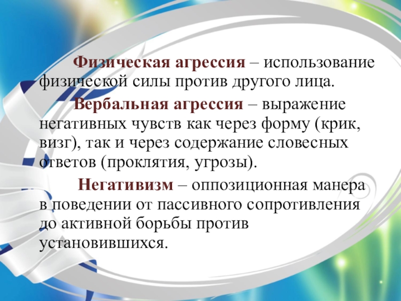 Вербальная агрессия – выражение негативных чувств как через форму (крик, визг), так и через содержание словесных ответов (проклятия, угрозы).