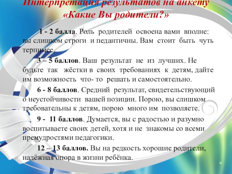 Слайд 17Интерпретация результатов на анкету «Какие Вы родители?»