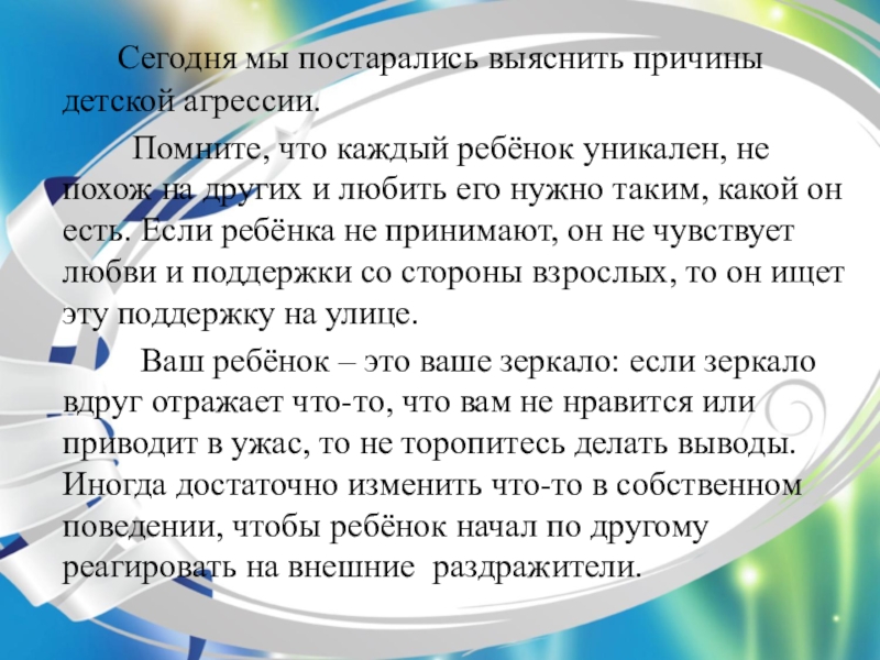 Помните, что каждый ребёнок уникален, не похож на других и любить его нужно таким, какой он есть. Если ребёнка не принимают, он не чувствует любви и поддержки со стороны взрослых, то он ищет эту поддержку на улице.