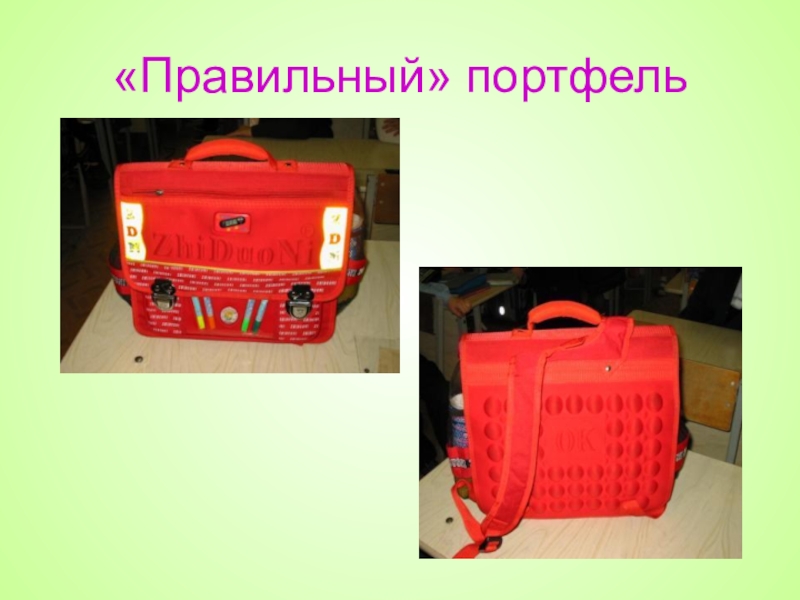 Слайд 12 Для сохранения правильной осанки школьника очень важны размеры и вес ранца.