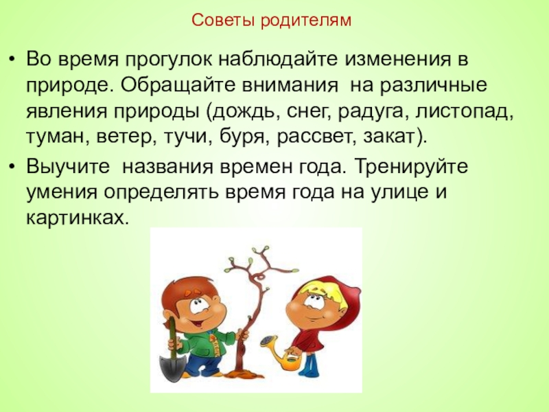 Выучите названия времен года. Тренируйте умения определять время года на улице и картинках.