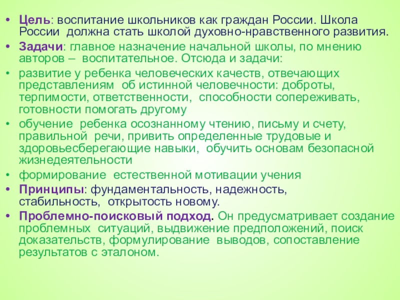 Задачи: главное назначение начальной школы, по мнению авторов – воспитательное. Отсюда и задачи: