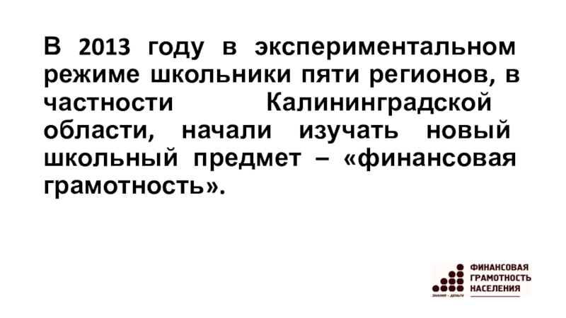 В 2013 году в экспериментальном режиме школьники пяти регионов, в частности Калининградской области, начали изучать новый школьный предмет – «финансовая грамотность».