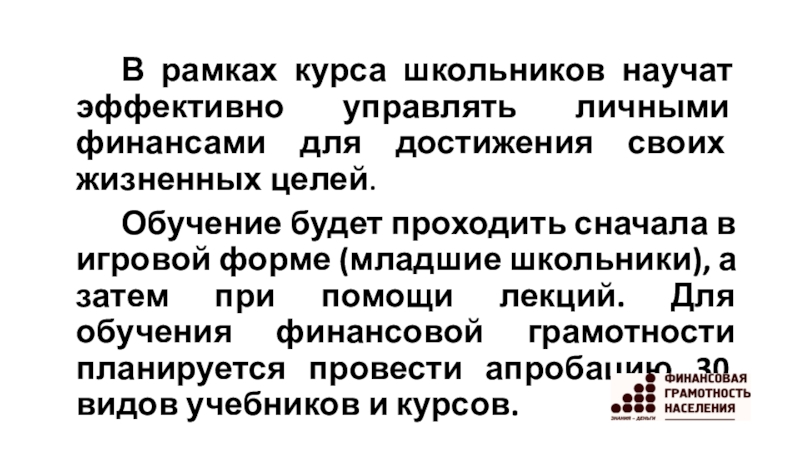 Обучение будет проходить сначала в игровой форме (младшие школьники), а затем при помощи лекций. Для обучения финансовой грамотности планируется провести апробацию 30 видов учебников и курсов.