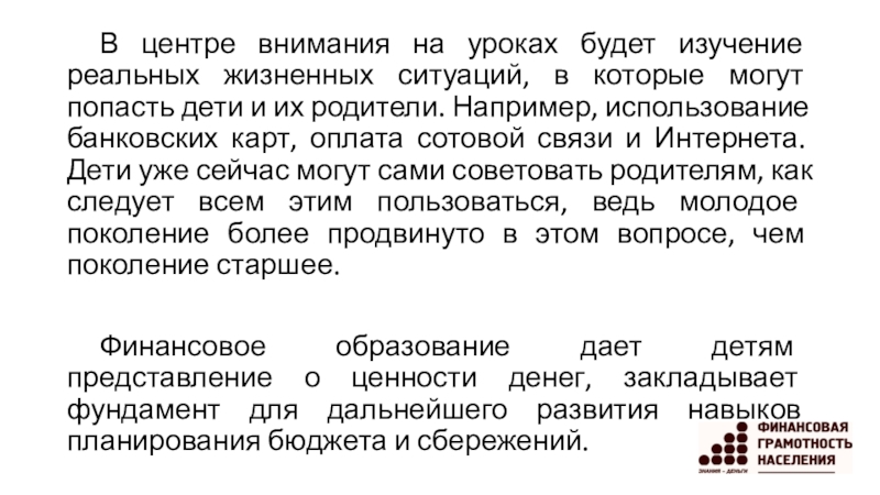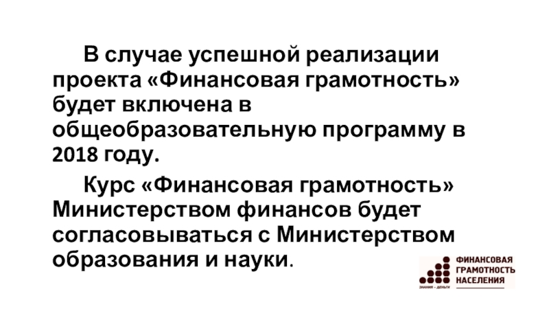 Слайд 4 В случае успешной реализации проекта «Финансовая грамотность» будет включена в