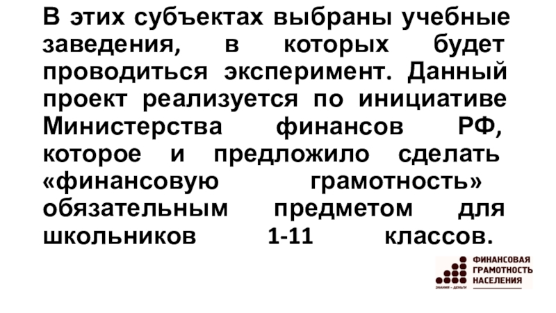 Данный проект реализуется по инициативе Министерства финансов РФ, которое и предложило сделать «финансовую грамотность» обязательным предметом для школьников 1-11 классов.