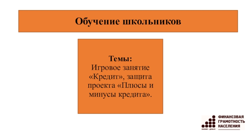 Обучение школьниковТемы:Игровое занятие «Кредит», защита проекта «Плюсы и минусы кредита».