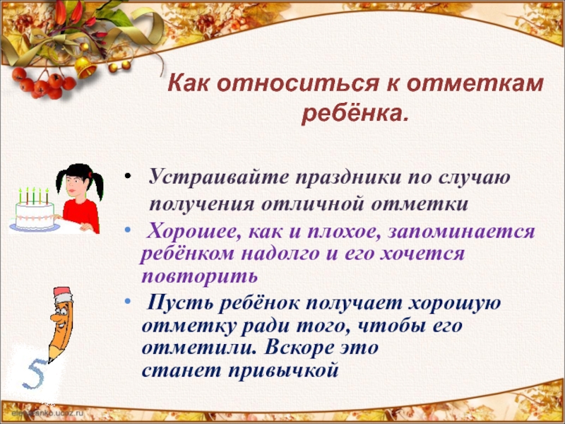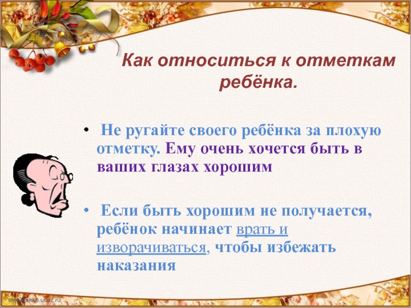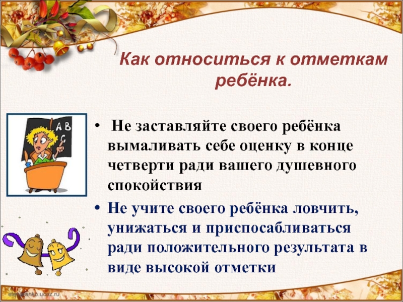 Слайд 15 Не заставляйте своего ребёнка вымаливать себе оценку в конце четверти