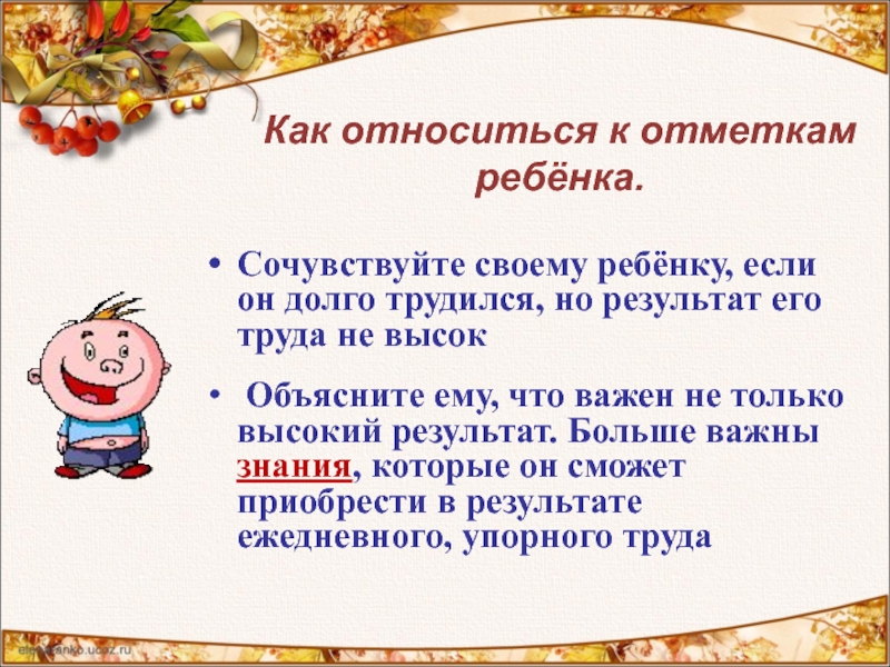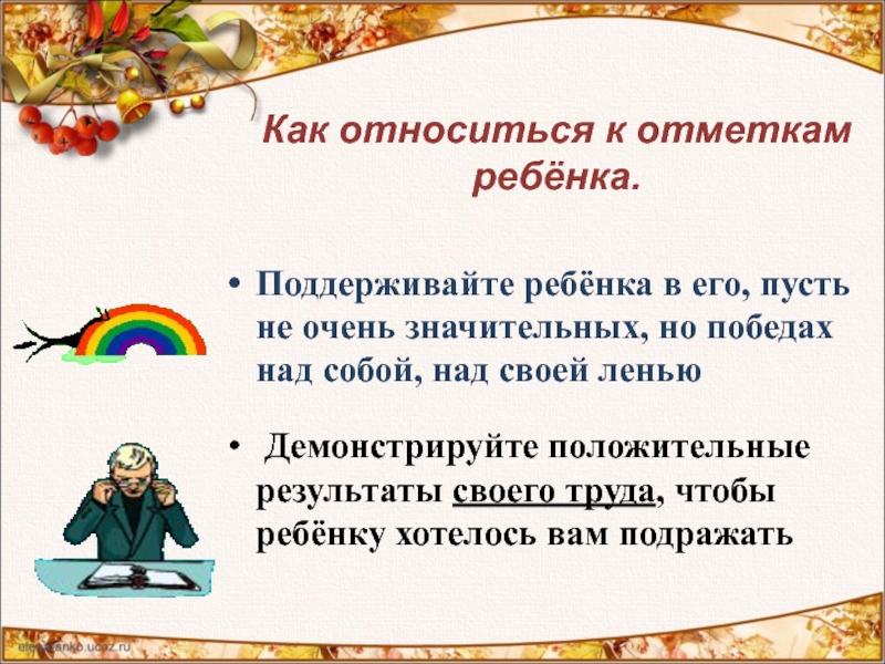Слайд 17Поддерживайте ребёнка в его, пусть не очень значительных, но победах над