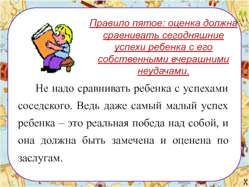 Слайд 34Правило пятое: оценка должна сравнивать сегодняшние успехи ребенка с его собственными
