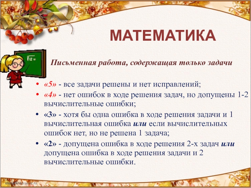 «4» - нет ошибок в ходе решения задач, но допущены 1-2 вычислительные ошибки;