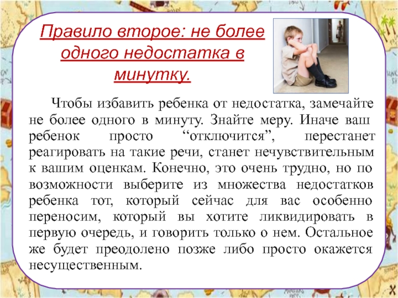 Чтобы избавить ребенка от недостатка, замечайте не более одного в минуту. Знайте меру. Иначе ваш ребенок просто “отключится”, перестанет реагировать на такие речи, станет нечувствительным к вашим оценкам. Конечно, это очень трудно, но по возможности выберите из множества недостатков ребенка тот, который сейчас для вас особенно переносим, который вы хотите ликвидировать в первую очередь, и говорить только о нем. Остальное же будет преодолено позже либо просто окажется несущественным.