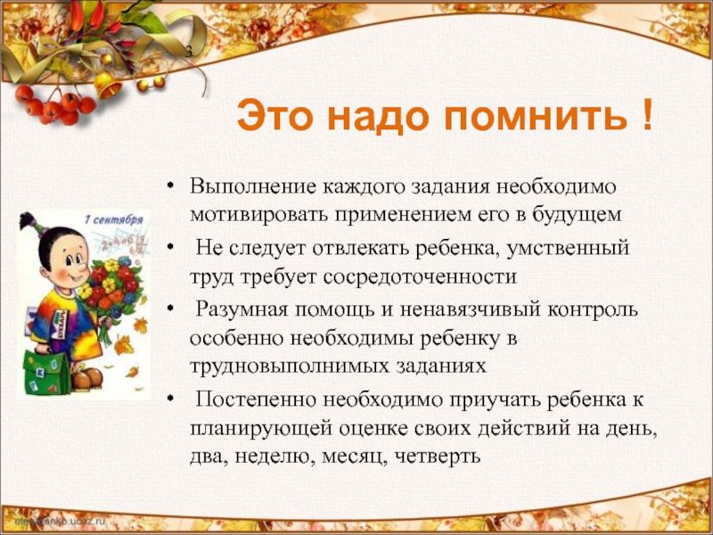 Настройте ребенка на выполнение заданий тех уроков, которые были сегодня, а задания на следующий день надо только повторить
