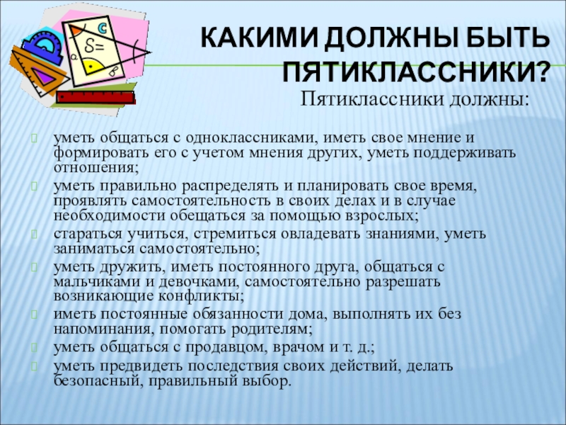 Слайд 6КАКИМИ ДОЛЖНЫ БЫТЬ ПЯТИКЛАССНИКИ?