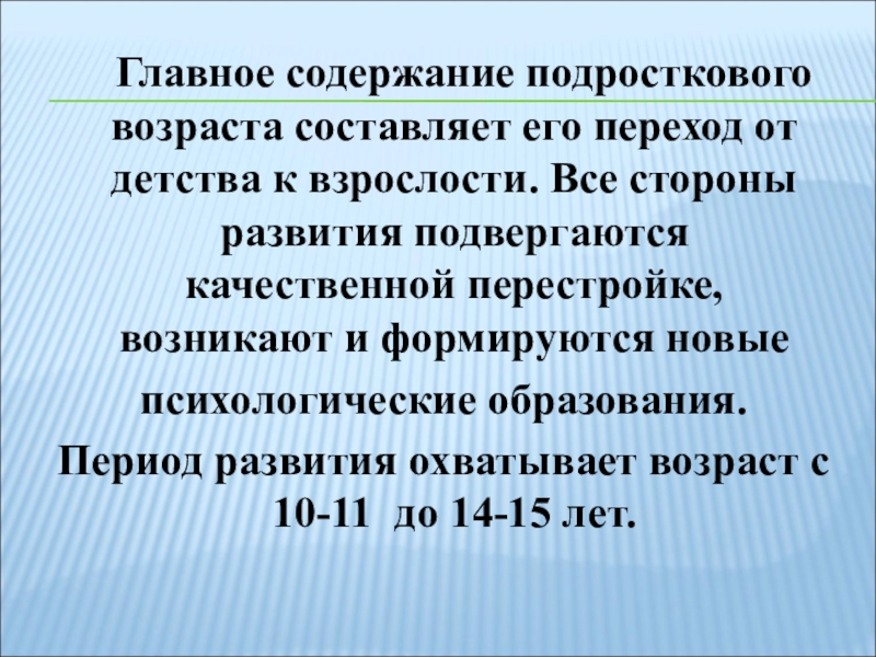 Слайд 2 Главное содержание подросткового возраста составляет его переход от детства