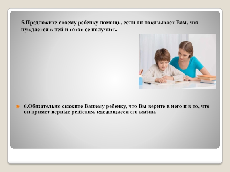 6.Обязательно скажите Вашему ребенку, что Вы верите в него и в то, что он примет верные решения, касающиеся его жизни.