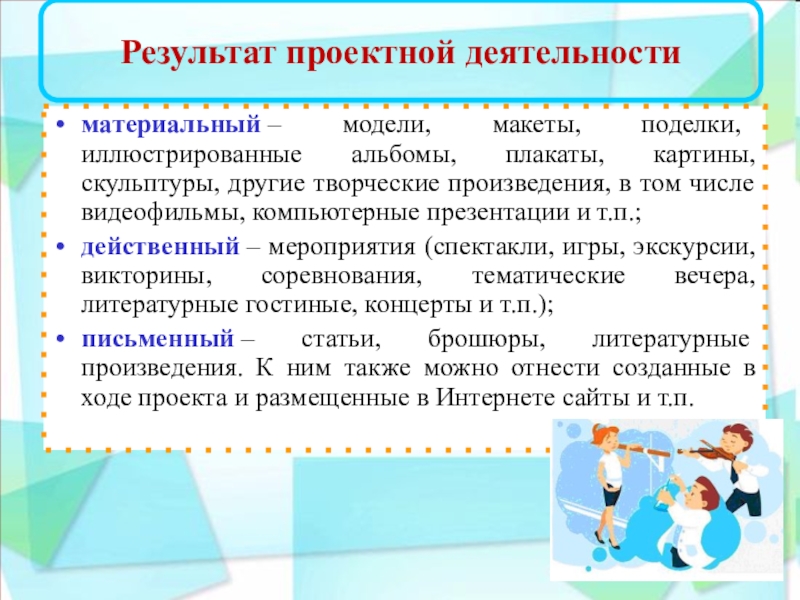 Цель – создание творческого продукта (газета, фильм, праздник), но результаты оформляются в продуманной завершенной форме (сценарии фильма или праздника, макет газеты).