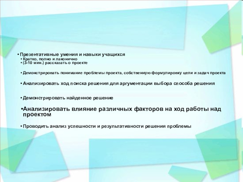 презентационные (выступать перед аудиторией, отвечать на незапланированные вопросы, использовать различные средства наглядности, демонстрировать артистические возможности);
