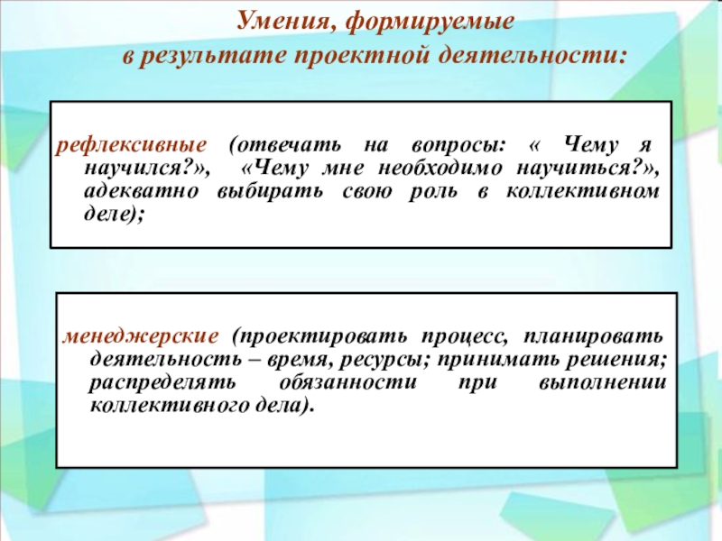менеджерские (проектировать процесс, планировать деятельность – время, ресурсы; принимать решения; распределять обязанности при выполнении коллективного дела).