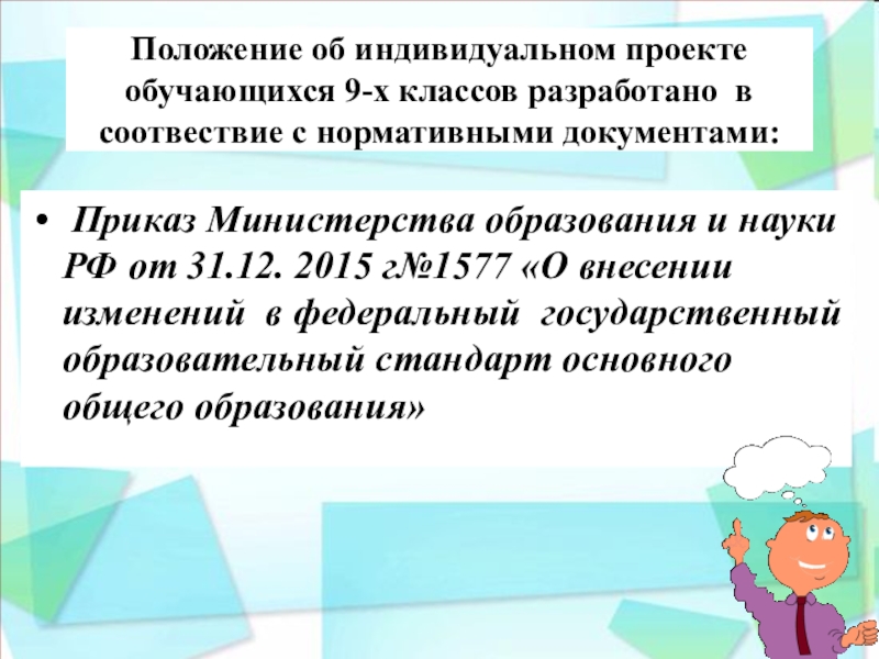 Приказ Министерства образования и науки РФ от 31.12. 2015 г№1577 «О внесении изменений в федеральный государственный образовательный стандарт основного общего образования»