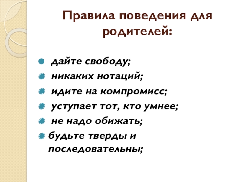 Правила поведения для родителей: дайте свободу; никаких нотаций; идите на компромисс; уступает тот, кто умнее; не надо