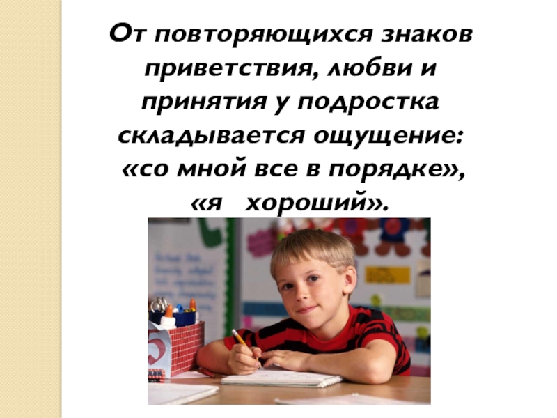 Слайд 5От повторяющихся знаков приветствия, любви и принятия у подростка складывается ощущение:
