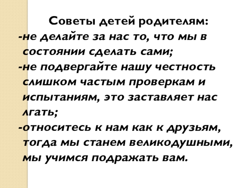 Советы детей родителям:не делайте за нас то, что мы в состоянии сделать сами;не подвергайте нашу честность слишком