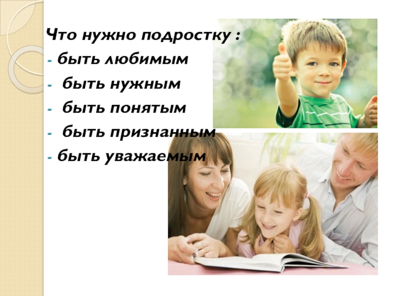 Что нужно подростку :быть любимым быть нужным быть понятым быть признаннымбыть уважаемым