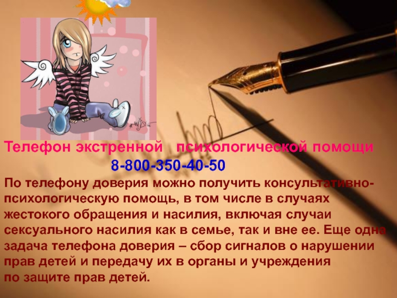 По телефону доверия можно получить консультативно-психологическую помощь, в том числе в случаях жестокого обращения и насилия, включая случаи сексуального насилия как в семье, так и вне ее. Еще одна задача телефона доверия – сбор сигналов о нарушении прав детей и передачу их в органы и учреждения по защите прав детей.