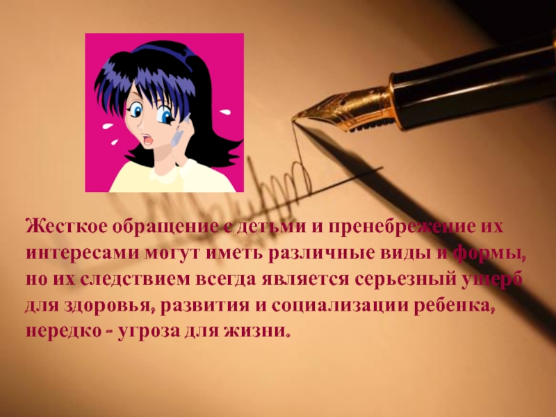 Слайд 18Жесткое обращение с детьми и пренебрежение их интересами могут иметь различные